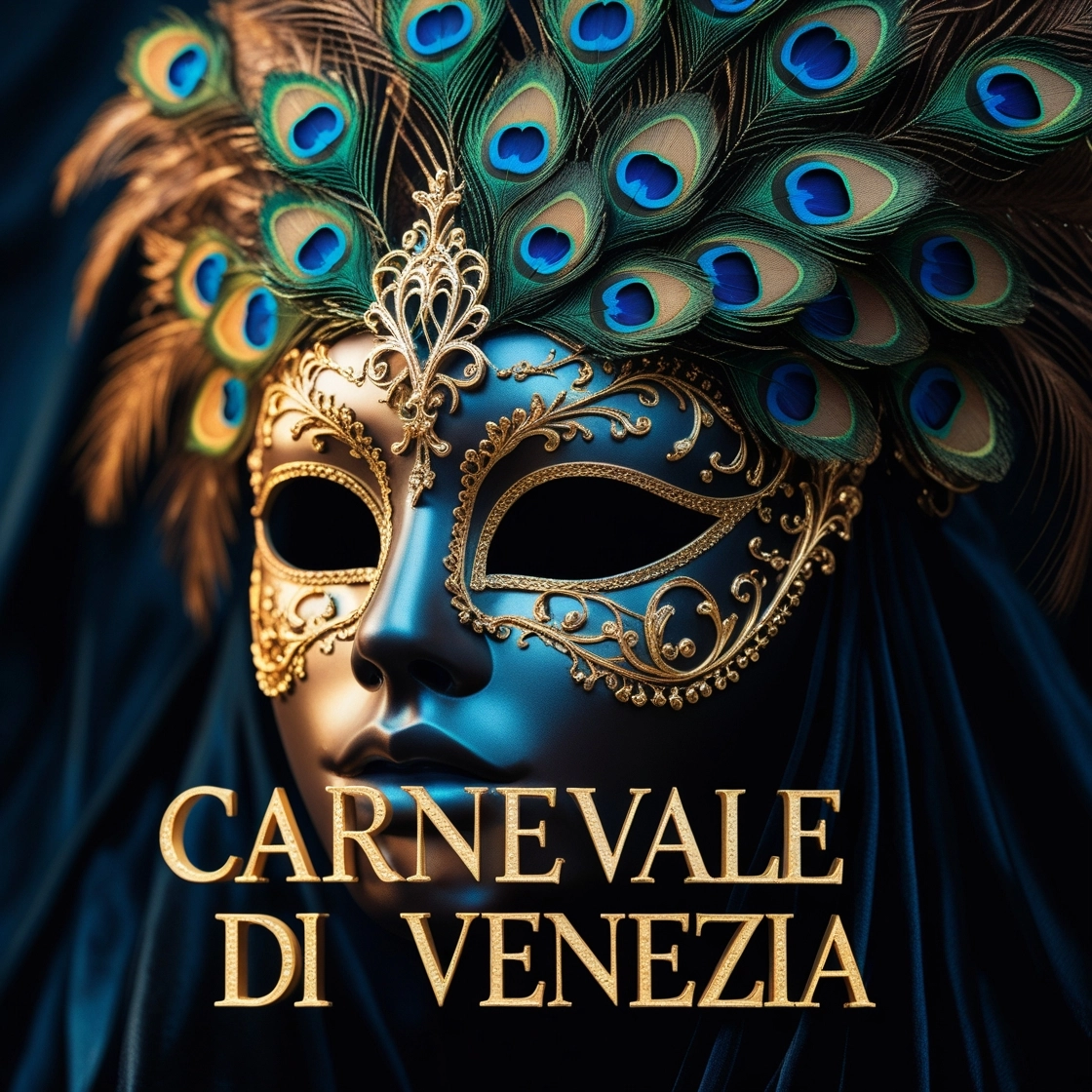 A luxurious, cinematic keyframe depicting a magnificent Venetian masquerade mask adorned with intricate gold filigree and majestic peacock feathers, set against a lavish, velvety black background. The mask's ornate details glimmer with subtle, warm lighting, casting a soft, golden glow. In the foreground, bold, Baroque-style lettering reads "Carnevale di Venezia" in a rich, golden font, evoking the opulence of 18th-century Venice. The overall aesthetic is reminiscent of the works of Maciej Kuciara, Jama Jurabaev, and Wojtek Fus, with a blend of cinematic color grading, shallow depth of field, and a subtle vignette effect, drawing the viewer's attention to the mask's exquisite details. The image is bathed in a warm, filmic tone, with the soft, creamy texture of Kodak Porta 400 and Cinestill 800, as if captured through the lens of a Leica M10 camera.